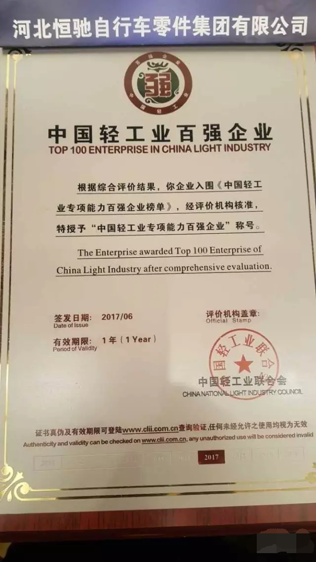 近日河北恒馳集團(tuán)榮獲“中國輕工業(yè)百強(qiáng)企業(yè)”、“中國自行車行業(yè)十強(qiáng)企業(yè)”榮譽(yù)稱號(hào)!